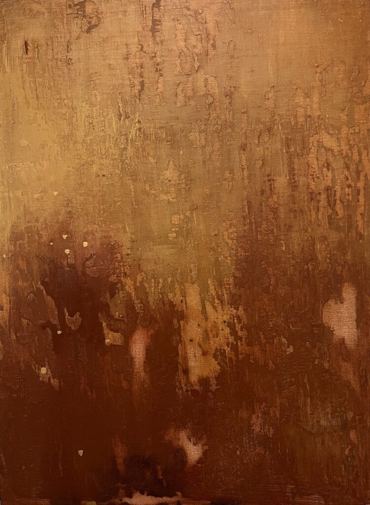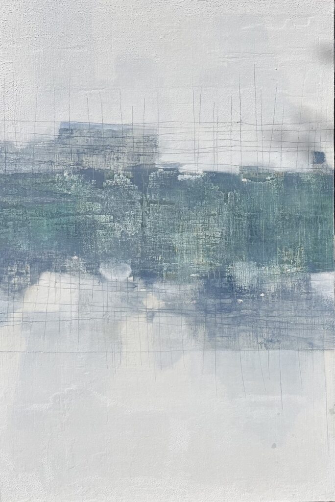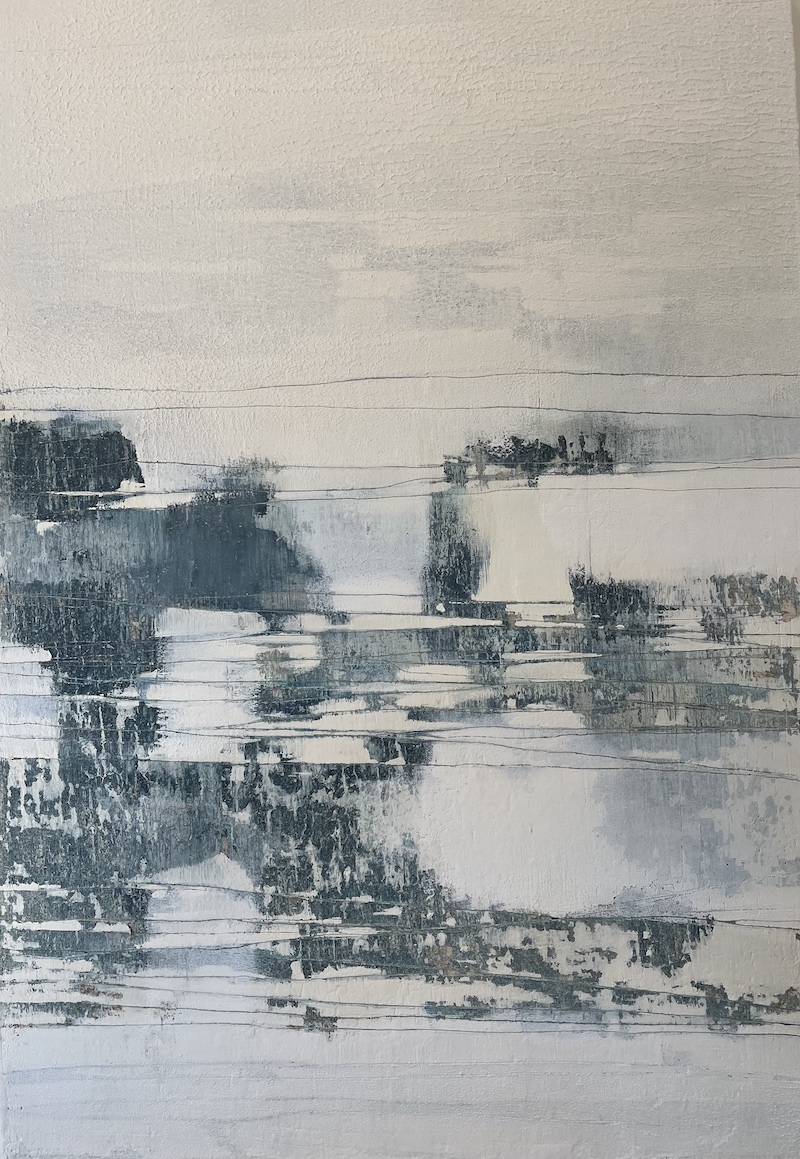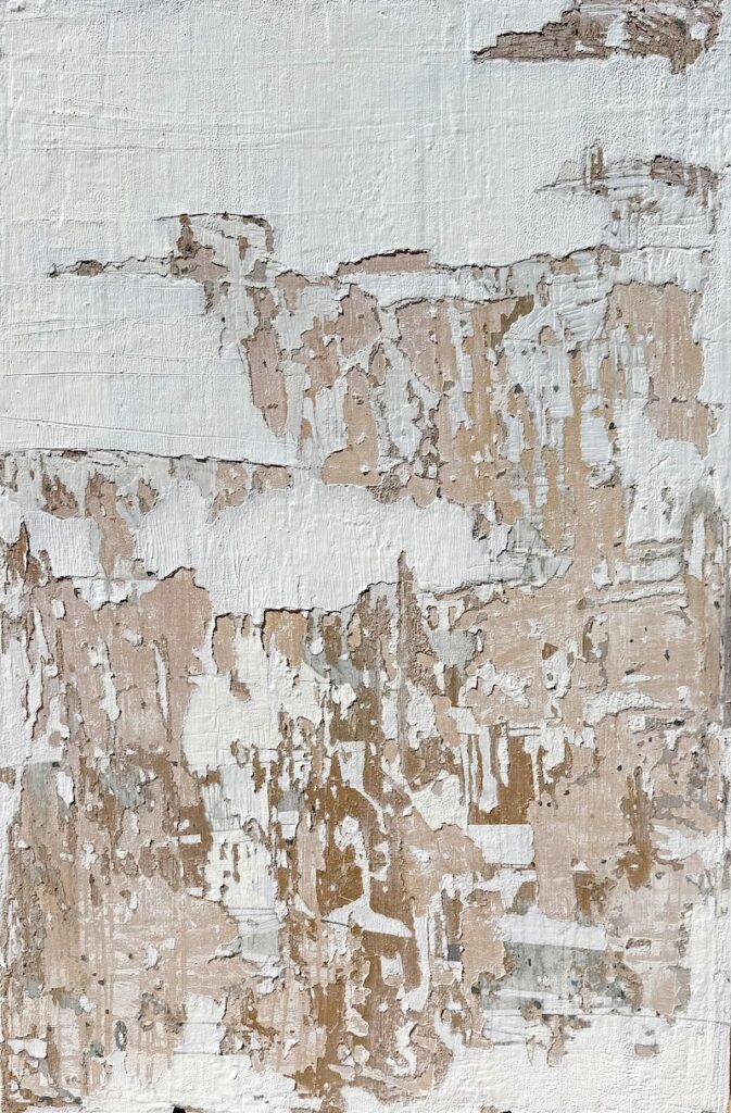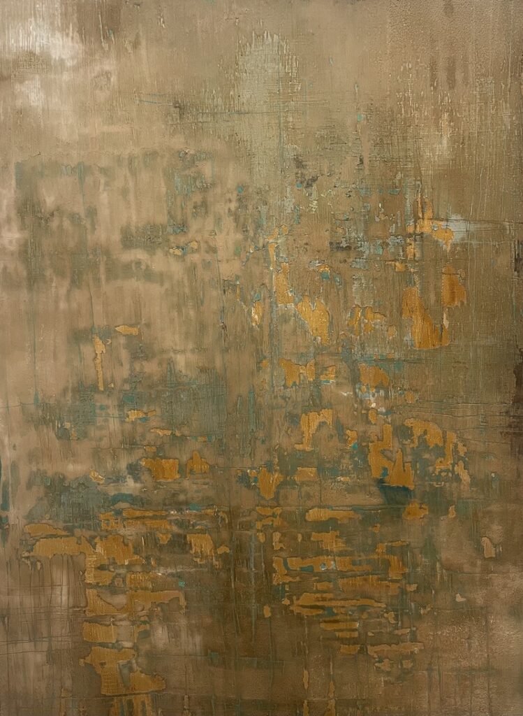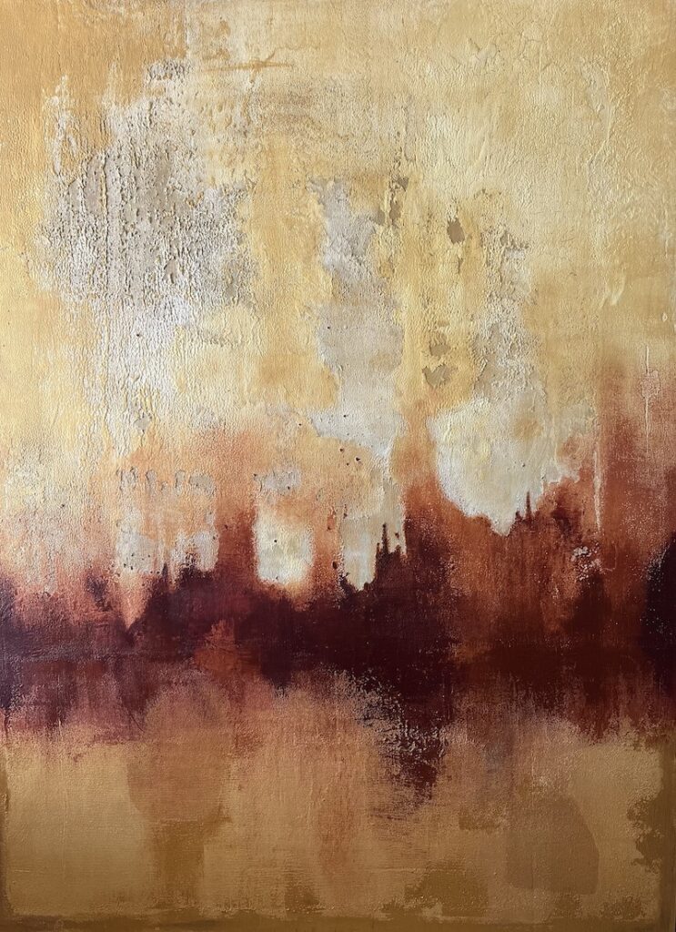 Sarita’s work revolves around time, texture, and memory. She builds her paintings through cycles of layering and removal — scraping, sanding, excavating — revealing the stories embedded beneath the surface. Her paintings feel geological, emotional, and alive. This tension between destruction and repair, fire and frost, permanence and impermanence, is exactly what shaped The Fire & Ice Collection.